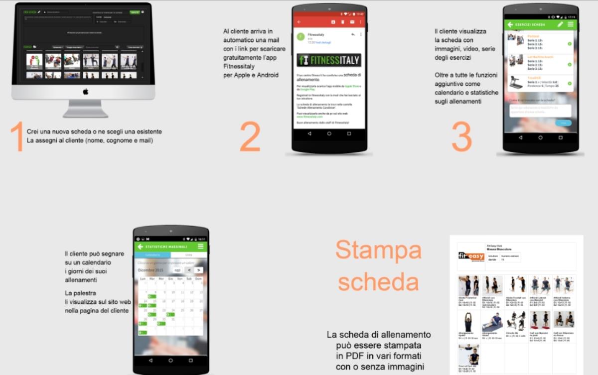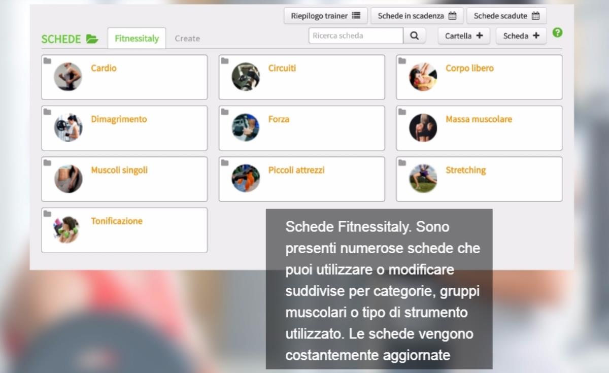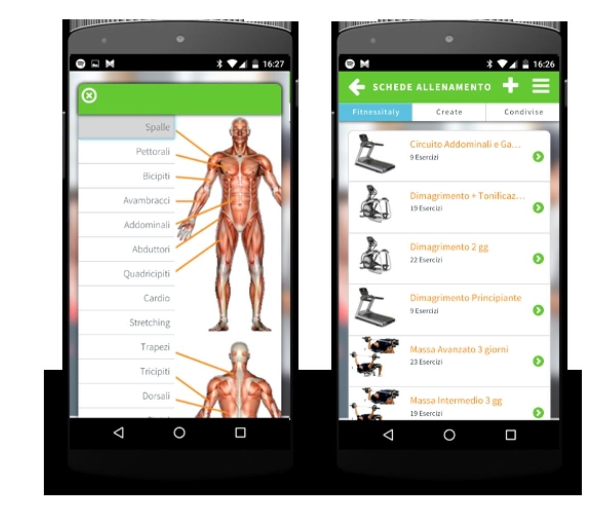 Schede suddivise per tipologia di allenamento (massa, definizione), livello di difficolt, strumento utilizzato (cavi, manubri, trx) o singoli muscoli (pettorali, addominali)