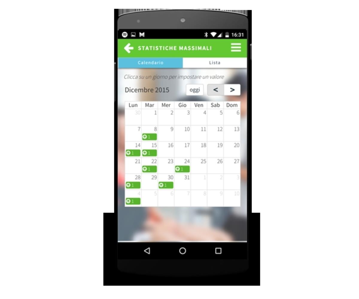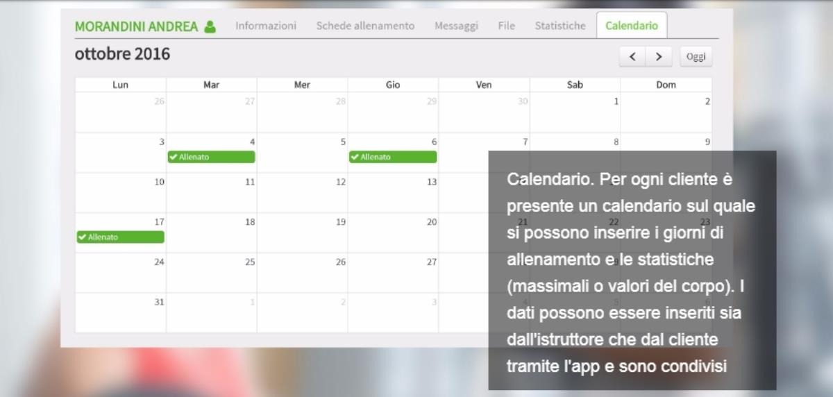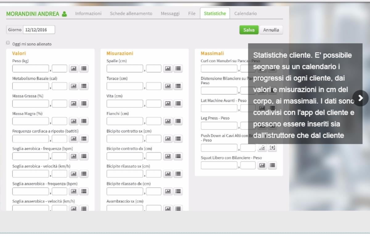 Sezione statistiche che consente al personal trainer di monitorare i progressi del cliente riportando i dati su un calendario e visualizzarne i progressi su grafici