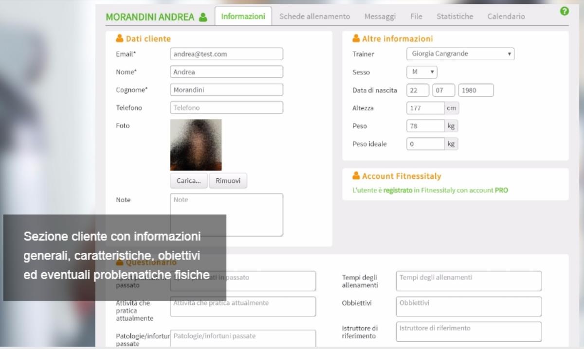 Anagrafica del cliente composta da numerosi campi come sport praticati attualmente e in passato, obiettivi, patologie/problemi fisici o istruttore di riferimento